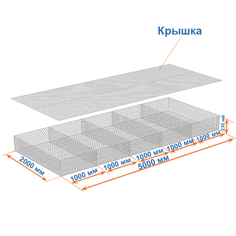 Матрасы Рено 5x2x0,23 — плоские габионные секции из сетки двойного кручения с ячейкой 80х100, проволокой 2,7 мм и покрытием Цинк.